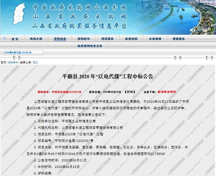 真心公司又再次成功中标山西省平顺县2020年“以电代煤”工程