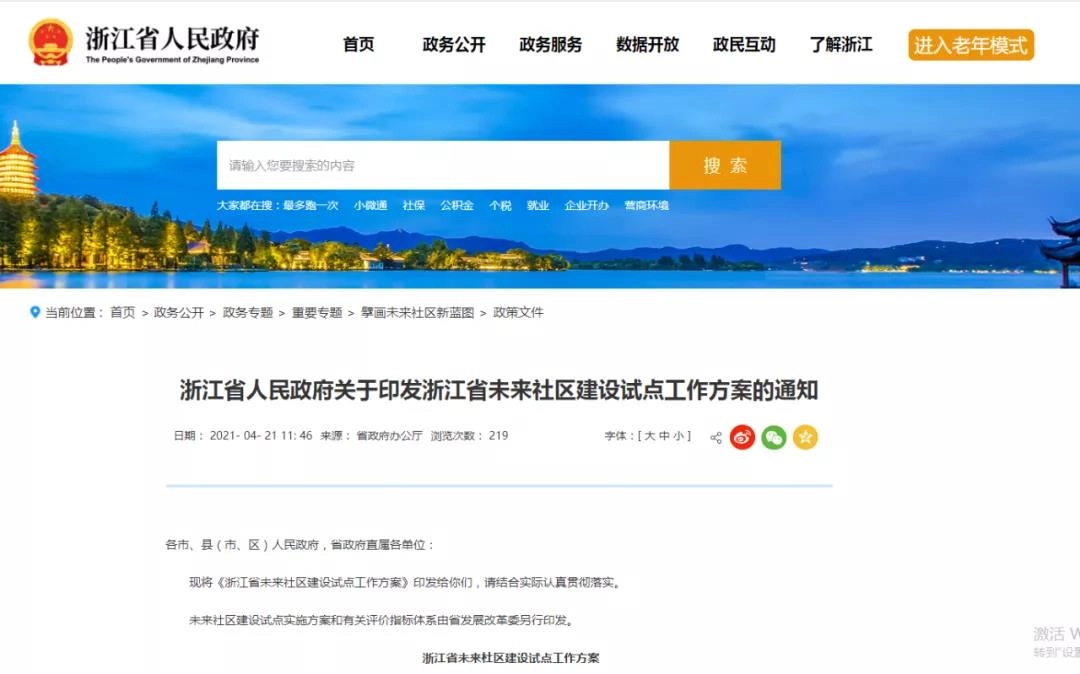 浙江省人民政府办公厅印发《浙江省人民政府关于印发浙江省未来社区建设试点工作方案的通知 》(以下简称《通知》)。
