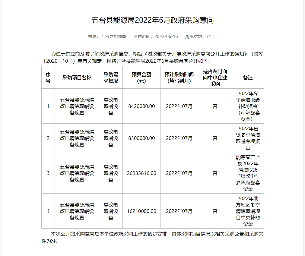 近日,山西省政府采购网发布宁武县、代县、偏关县、保德县、静乐县、定襄县、五台县及五台山风景名胜区、忻州市忻府区、岢岚县、繁峙县、神池县、河曲县、原平市、闻喜县、介休市等共15个市县地区政府煤改电取暖设备采购意向。预算总金额超13.5485万。