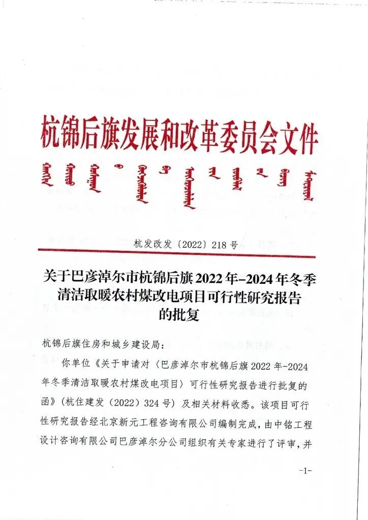 杭锦后旗发展和改革委员会9月21日发布关于巴彦淖尔市杭锦后旗2022年—2024年冬季清洁取暖农村煤改电项目可行性研究报告(以下简称报告)的批复。