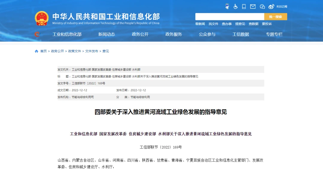 工业和信息化部 国家发展改革委 住房城乡建设部 水利部关于深入推进黄河流域工业绿色发展的指导意见。