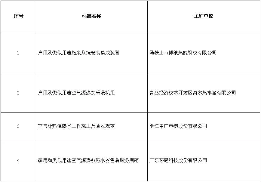 近日,国家能源局发布2018年第8号公告,由中国节能协会组织起草的《户用及类似用途热泵系统安装集成装置》(标准号:NB/T 34065-2018)、《户用及类似用途空气源热泵采暖机组》(标准号:NB/T 34066-2018)、《空气源热泵热水工程施工及验收规范》(标准号:NB/T 34067-2018)、《家用和类似用途空气源热泵热水器售后服务规范》(标准号:NB/T 34068-2018)等四项标准正式批准发布,将于2018年10月1日实施。