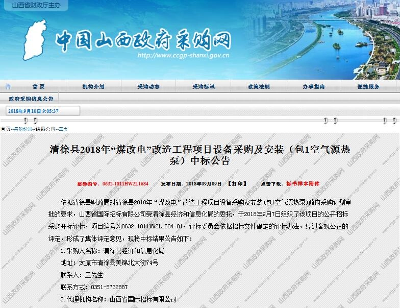 最新消息!中国山西政府采购网公布了“清徐县2018年“煤改电”改造工程项目设备采购及安装(包1空气源热泵)项目”中标公告,于2018年9月7日组织了该项目的公开招标采购开标评标,评标委员会依据招标文件确定的评标办法,经过客观公正的评定,真心公司再度夺得山西“煤改电”项目,这是自2016年起连续3年中标山西“煤改电”项目。