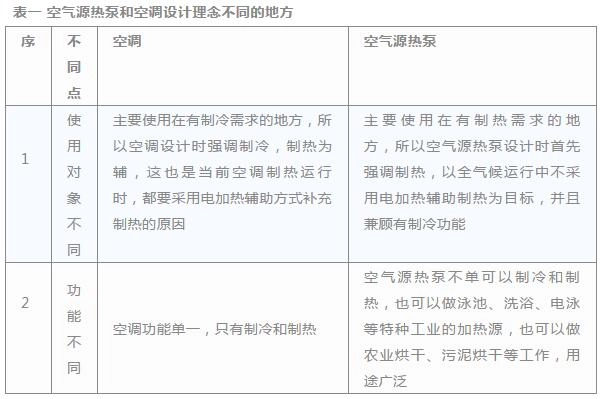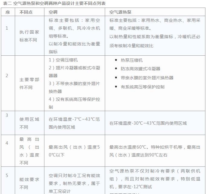 由于两种产品的使用对象不同,决定他们采用的国家标准、选用的零部件、使用的地域、出风(或出水)温度、能效等均不同,列表分析如下: