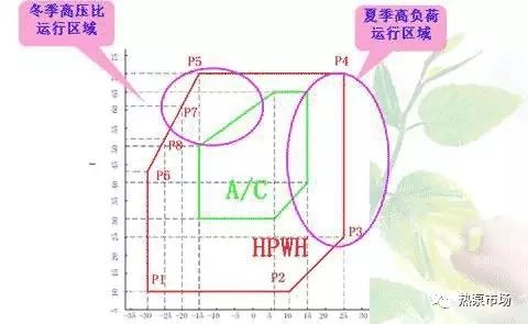 图中,横轴对应蒸发温度(相当于热泵的室外环境温度),纵轴对应冷凝温度(相当于热泵的使用侧的出风或水温度),可以看出,热泵压缩机的运行范围是在空调压缩机上有成倍的扩大。