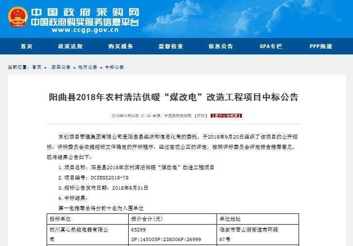 公布了阳曲县2018年农村清洁供暖“煤改电”改造工程项目中标名单