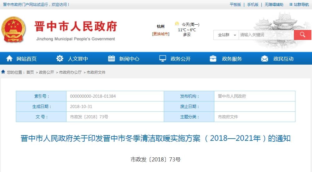 2018年,太谷、祁县、平遥、灵石、介休建成区清洁取暖率达到70%以上,其他县、区建成区达到50%以上;