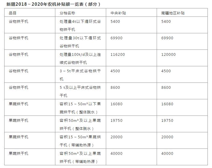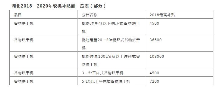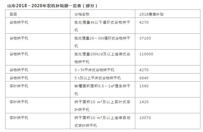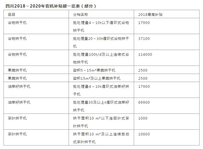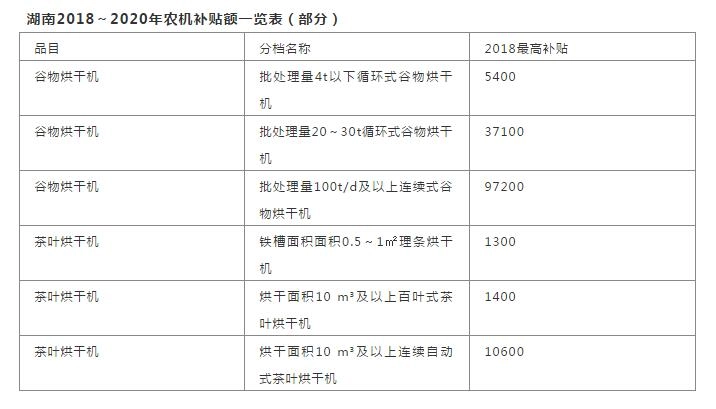 为切实做好2018~2020年农机购置补贴工作,近期农业部农业机械化技术开发推广总站发布《2018~2020年全国通用类农业机械中央财政资金最高补贴额一览表》,在第五大类第三小类中,干燥机械部分的3个品目:谷物烘干机、果蔬烘干机、油菜籽烘干机;在第六大类的茶叶加工机械中也有一个品目:茶叶炒(烘)干机。一般补贴机具单机补贴额原则上不超过5万元;烘干机单机补贴额最高12万元。