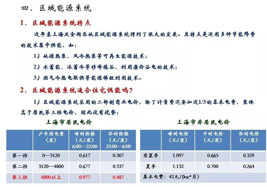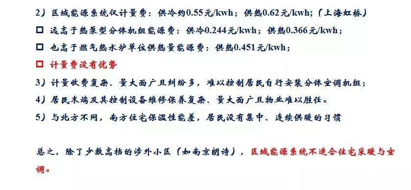 第三类是区域能源系统,近年来上海及全国各地区域能源系统得到了很大的发展,其特点是运用多种节能降费的技术集中供能。但是区域能源系统采用商业电价,除了计量费还要加近1/3的基本电费,整体高于居民第三档电价。区域能源系统仅计量费:供冷约0.55元/kwh;供热0.62元/kwh;(上海虹桥)。而且区域能源系统计量收费复杂、量大面广且纠纷多,难以控制居民自行安装分体空调机组。