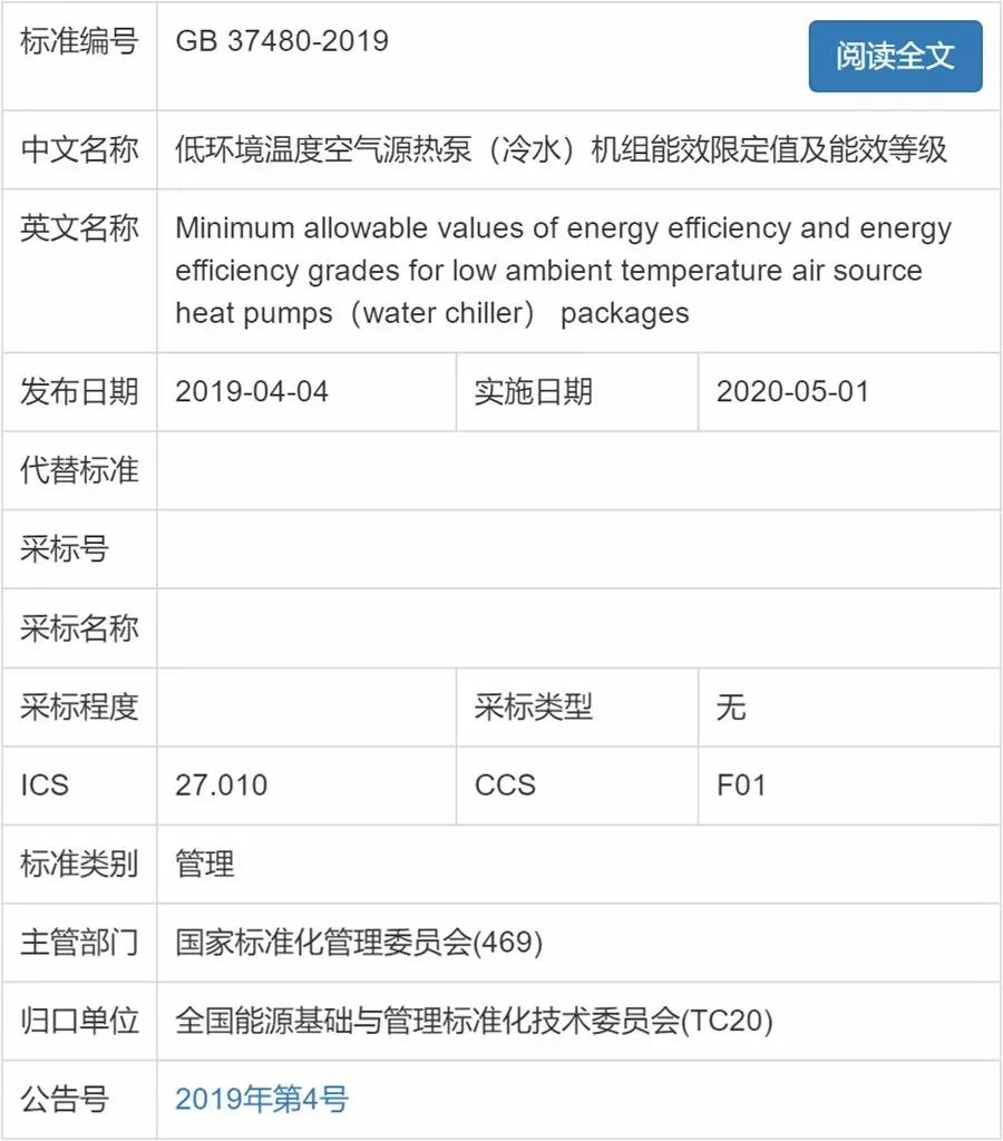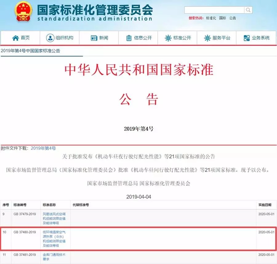 2019年4月4日,国家市场监督管理总局、国家标准化管理委员会联合发布了2019年第4号中华人民共和国国家标准公告,公告批准了《机动车昼间行驶灯配光性能》等21项国家标准,其中《低环境温度空气源热泵(冷水)机组能效限定值及能效等级》(GB 37480-2019)位列国家标准第10项。公告显示该项国家强制标准2020年5月1日起实施,且归口单位为全国能源基础与管理标准化技术委员会,主管部门为国家标准化管理委员会。