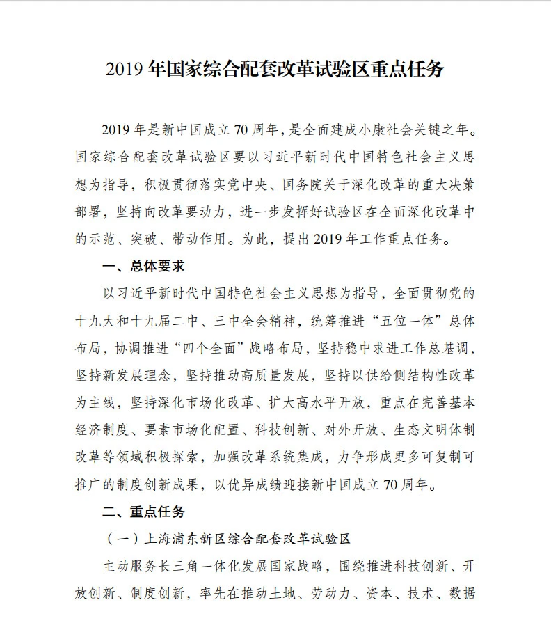 5月10日,国家发展改革委网站对外发布《2019年国家综合配套改革试验区重点任务》(以下简称《重点任务》),要求12个改革试验区重点在完善基本经济制度、要素市场化配置、科技创新、对外开放、生态文明体制改革等领域进行积极探索,加强改革系统集成,力争形成更多可复制可推广的制度创新成果。