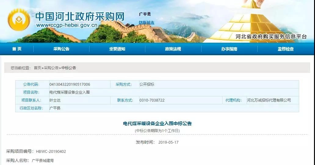 真心公司再次又再度夺得河北广平县“煤改电”项目。