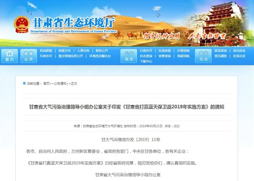 5月21日,记者从省生态环境厅了解到,省大气污染治理领导小组办公室于日前正式印发《甘肃省打赢蓝天保卫战2019年实施方案》。今年全省14个市州所在城市PM10、PM2.5年均浓度较2015年分别下降20%、21.4%,空气质量平均优良天数比率达到85.5%以上。方案指出: