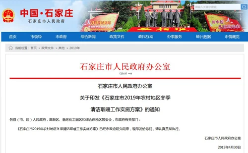 为做好2019年冬季清洁取暖工作,石家庄接连发布了:《关于做好2019年农村地区冬季清洁取暖招标工作的通知》、《石家庄市2019年强化农村劣质散煤管控工作方案》、《石家庄市2019年供热保障实施方案》、《石家庄市2019年农村地区冬季清洁取暖工作实施方案》。