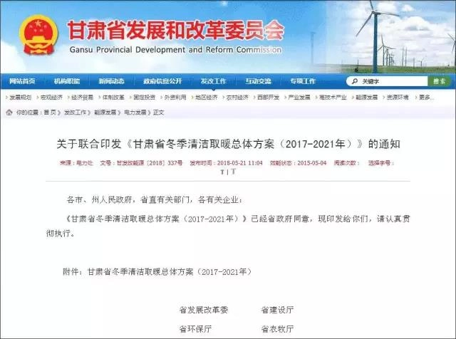 《甘肃省冬季清洁取暖总体方案(2017-2021年)》