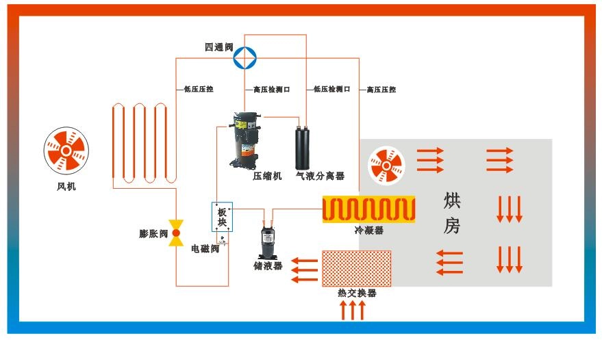 高温热泵烘干机组,主要有翅片式蒸发器(外机)、压缩机、翅片冷凝器(内机)和膨胀阀四部分组成,通过让工质不断完成蒸发(吸取室外环境中的热量)→压缩→冷凝(在室内烘干房中放出热量)→节流→再蒸发的热力循环过程,从而将外部低温环境里的热量转移到烘干房中,冷媒在压缩机的作用下在系统内循环流动。它在压缩机内完成气态的升压升温过程(温度高达100℃),它进入内机释放出高温热量加热烘干房内空气,同时自己被冷却并转化为流液态,当它运行到外机后,液态迅速吸热蒸发再次转化为气态,同时温度可下降至-20℃~-30℃,这时吸热器周边的空气就会源源不断地将热量传递给冷媒。