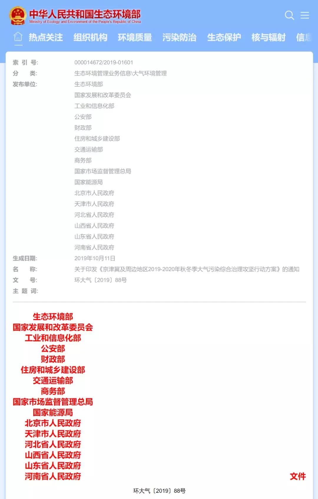 京津冀及周边地区2019-2020年秋冬季大气污染综合治理攻坚行动方案