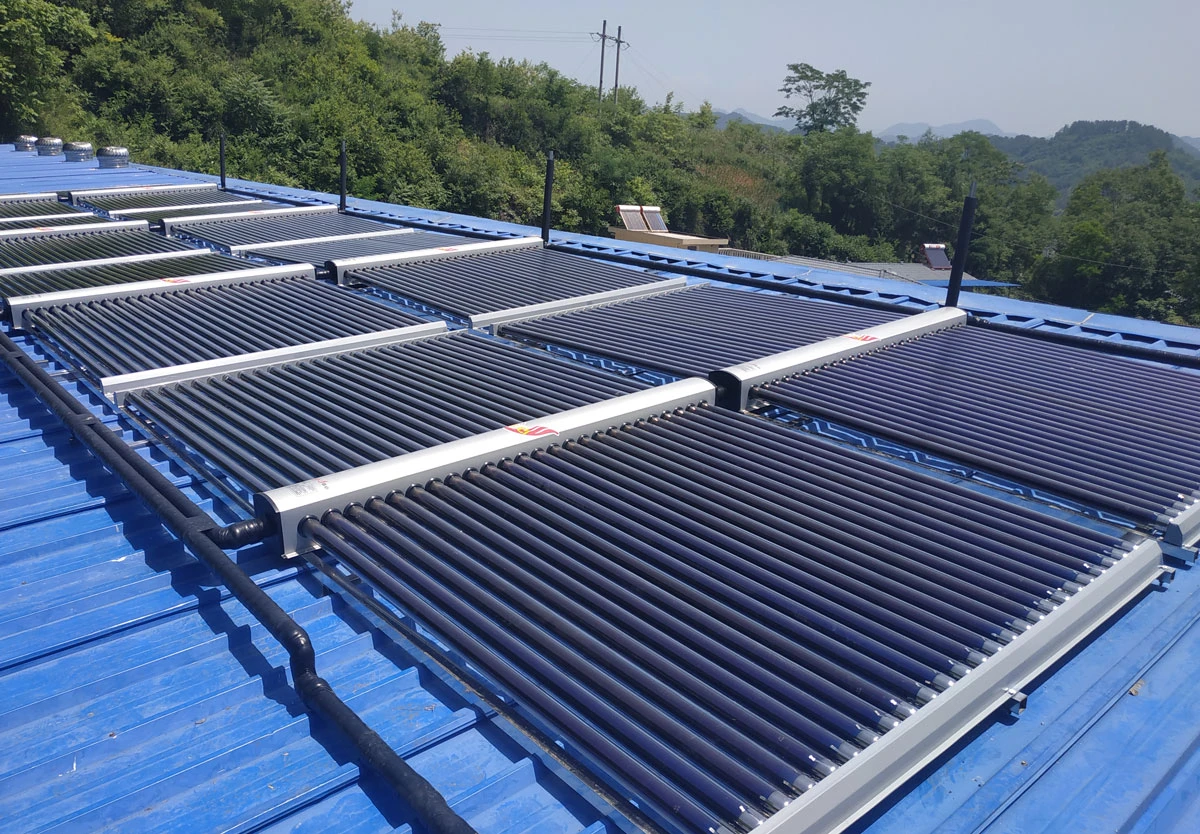 由于屠宰厂氨气较重,大部分厂房采用的是树脂瓦面,且承重不足,无法安放太阳能,只有冷库和肉架厂房采用了双层保温彩钢板人字形屋面,由于该厂房要悬挂生猪,所以承重很好,而且屋面总面积500多平方,位置足够,故400支工程连箱太阳能就安装在此人字形屋面顶上。