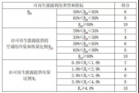 本条对由可再生能源提供的生活热水比例、空调用冷量和热量比例、电量比例进行分档评分。当建筑的可再生能源利用不止一种用途时,可各自评分并累计,当累计得分超过10分时,应取为10分。空气源热泵及工业余热、废热提供生活热水时评分也参照可再生能源提供生活热水比例计算方法。