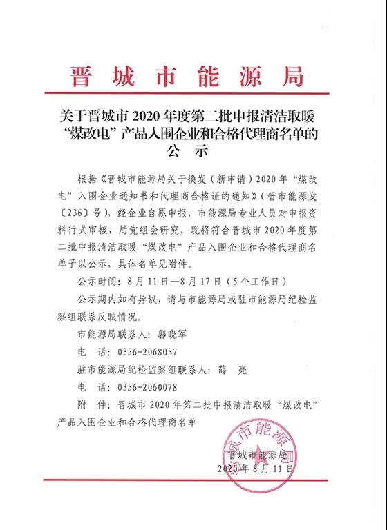 晋城市2020年第二批申报清洁取暖“煤改电”入围企业名单