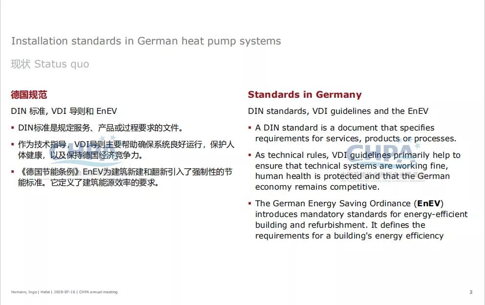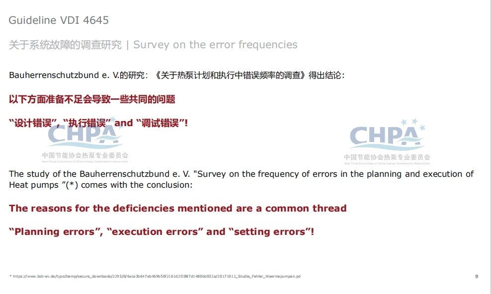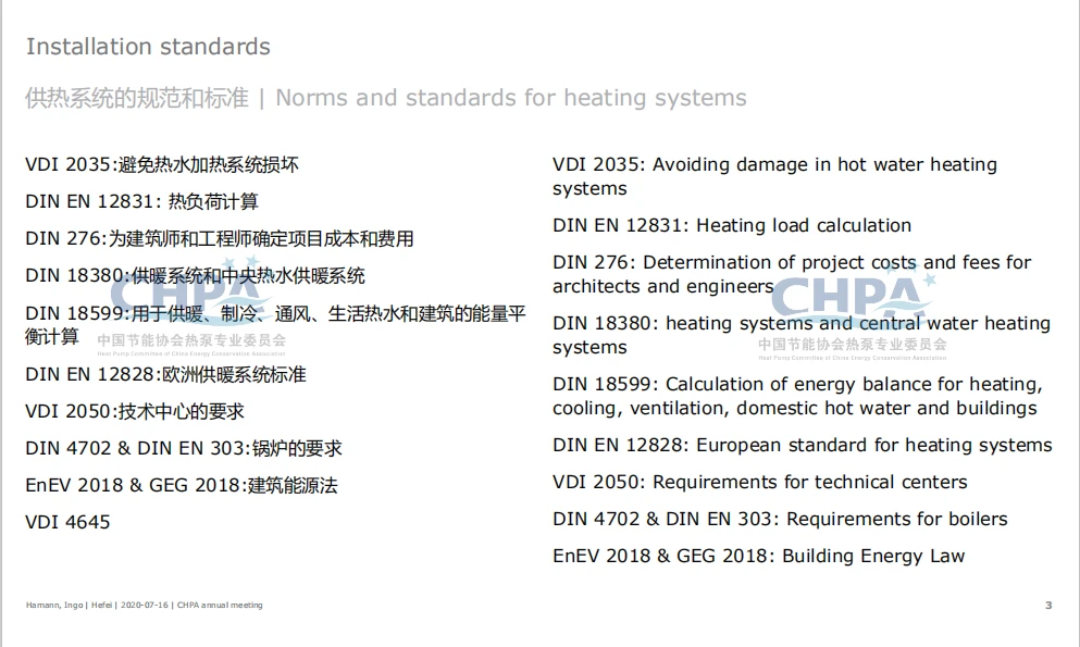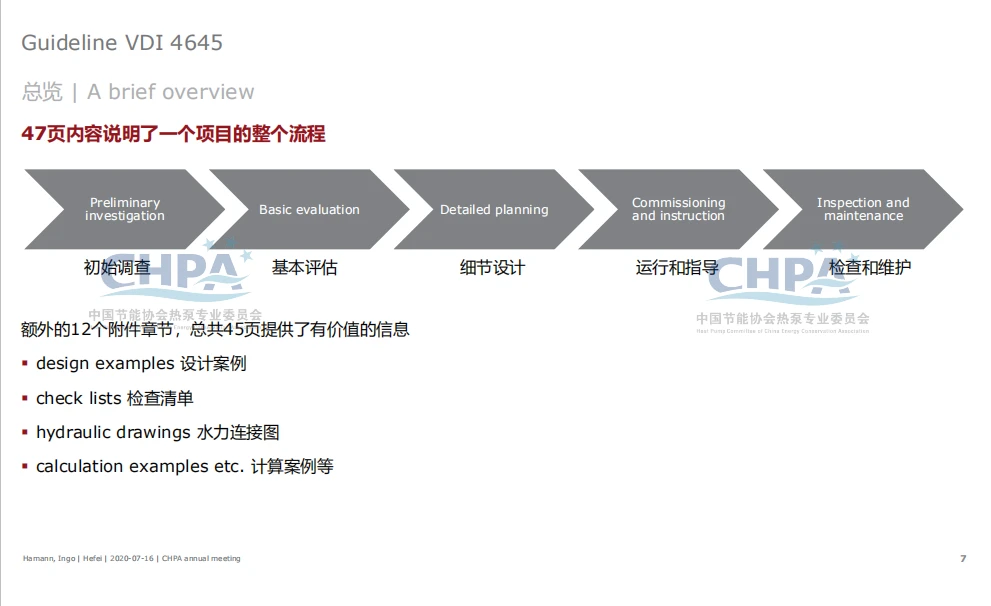 VDI4645共有47页正文内容,12个附件章节。47页正文主要内容为一个项目的全部流程,对潜在客户进行项目现场实地信息调查;给出基本评估建议;进行系统设计,系统设计需参考前边提到的规范;运行和指导,安装完成之后会有一个运行指导,就是通常所说的调试环节;检查维护,附件里提到检查维护有一些工作必须要做,例如准备设计系统水利部分的一些必备的部件,清单的检查,全部完成之后才会进行到运行和指导的步骤,所以最终需要完整的清单,以及在附件当中还会有一些设计的案例,目前大部分热泵企业都会这样去做。