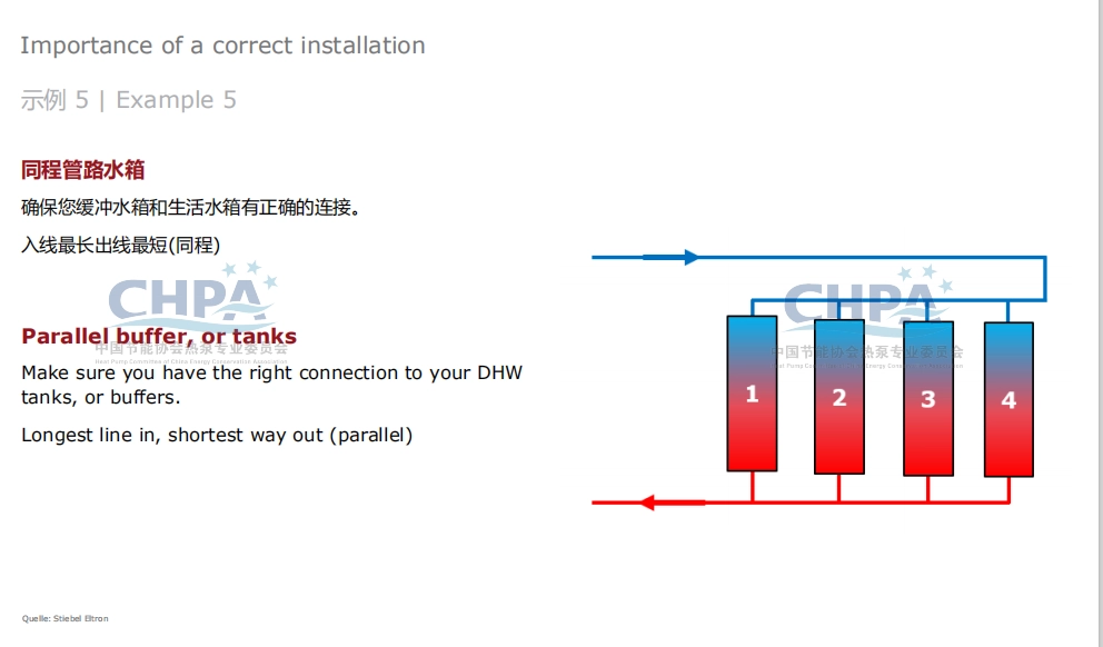 示例5主要讲的是同程管路水箱,当出现多个缓冲水箱要考虑它的容积、考虑管路的连接,因为整个液位在同一水平面上,要防止产生变化。