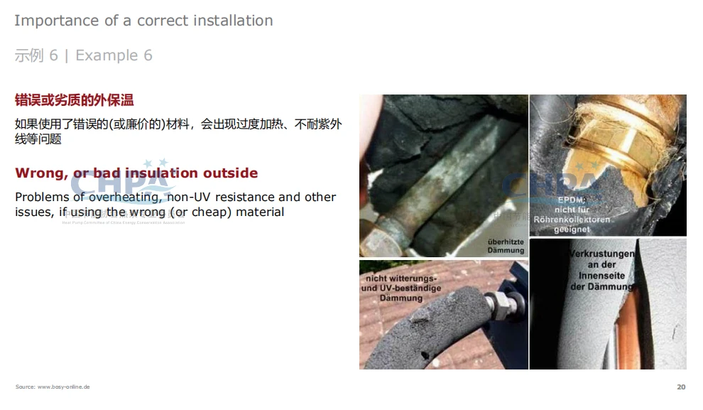 下面几个示例在德国的导则里属于不合格的保温,下图中右上图是水温过高引起了保温损坏,下面可能是因为鸟去啄保温,引起了它的损坏。