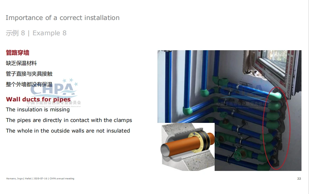 特别讲一下,管道穿墙的时候,在墙体内部也要做保温,不然在热水在穿墙过程中会引起较大的损耗。在做管道固定的时候,不同的爬坡和管道之间也要做保温,这些是导则里面的一些细节问题。