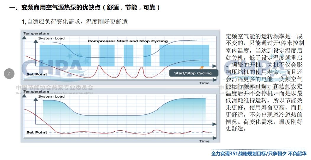 首先我为大家讲一下变频商用空气源热泵的优缺点,现在市场上的产品90%是定速,目前正处于定速向变频的转化的过程,我们从舒适、节能和可靠三个纬度来对比变频商用和定速商用的不同之处。其次讲一下变频商用空气源热泵的设计特点。