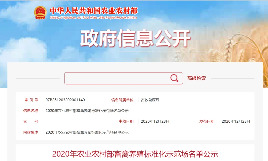 为贯彻落实《国务院办公厅关于稳定生猪生产促进转型升级的意见》《国务院办公厅关于促进畜牧业高质量发展的意见》,我部组织开展了2020年畜禽养殖标准化示范创建活动。按照《畜禽养殖标准化示范创建活动工作方案》要求,经企业自愿申请、省级畜牧行政主管部门遴选推荐、我部组织专家评审,共有180家畜禽养殖场符合标准。经部领导审定同意,现将2020年农业农村部畜禽养殖标准化示范场名单予以公示,公示期为2020年12月23日至29日。公示期间,如有异议,请与农业农村部畜牧兽医局联系。
