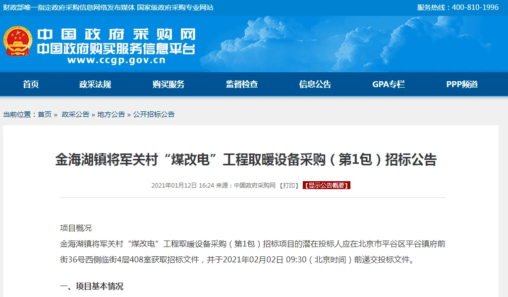 项目名称:金海湖镇将军关村“煤改电”工程取暖设备采购1-2包