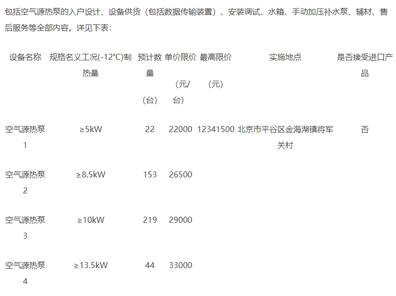 采购需求:包括空气源热泵的入户设计、设备供货(包括数据传输装置)、安装调试、水箱、手动加压补水泵、辅材、售后服务等全部内容。