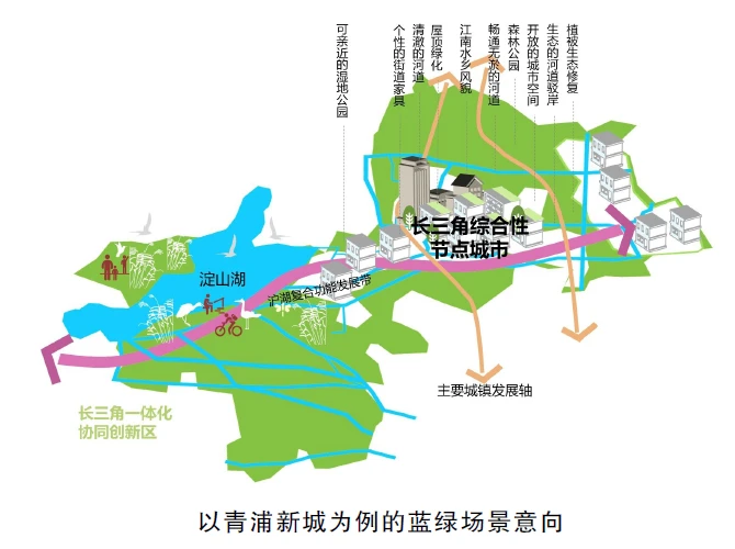 立足新城水绿资源特色,借鉴黄浦江、苏州河滨水公共空间开发建设模式经验,发挥生态资源贯通和叠加效应,以水为脉,以绿为体,顺沿各级河湖网络完善环廊森林体系,基本形成蓝绿交织、开放贯通的“大生态”格局,创造宜居、宜业、宜乐、宜游环境,实现生态惠及沿线人民。落实公园城市理念,形成环城森林公园带;挖掘生态文化底蕴,塑造美丽特色新城;强化生态环境保护,构建优美生态空间。推动人与自然和谐共生新城建设,打造长三角蓝绿交融生态新城标杆。