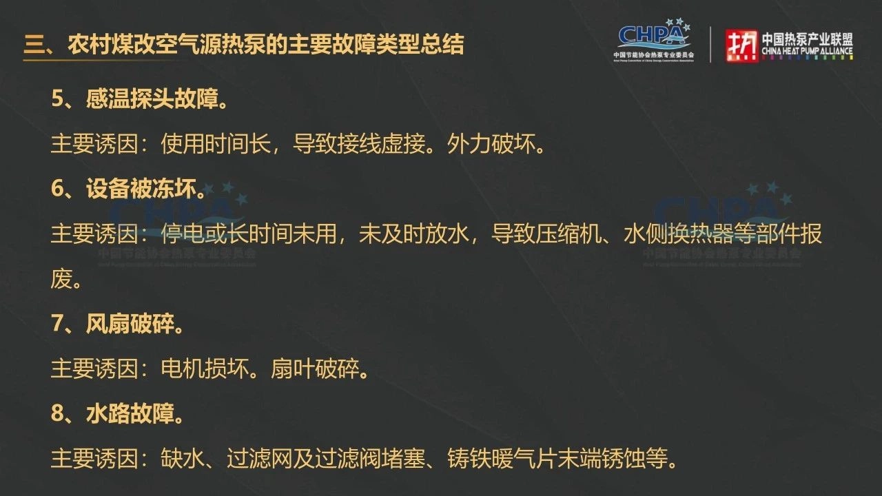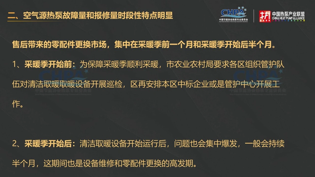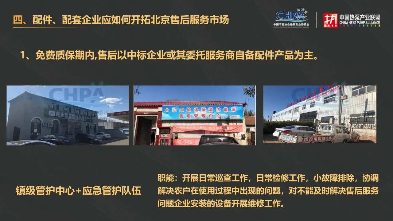 大家好,我今天的分享主要包含四个方面:一个是北京煤改空气源热泵售后的市场规模,二是北京煤改空气源售后服务市场的主要特点,三是农村煤改空气源热泵的主要故障类型,四是配件、配套企业应如何开拓北京售后服务市场。