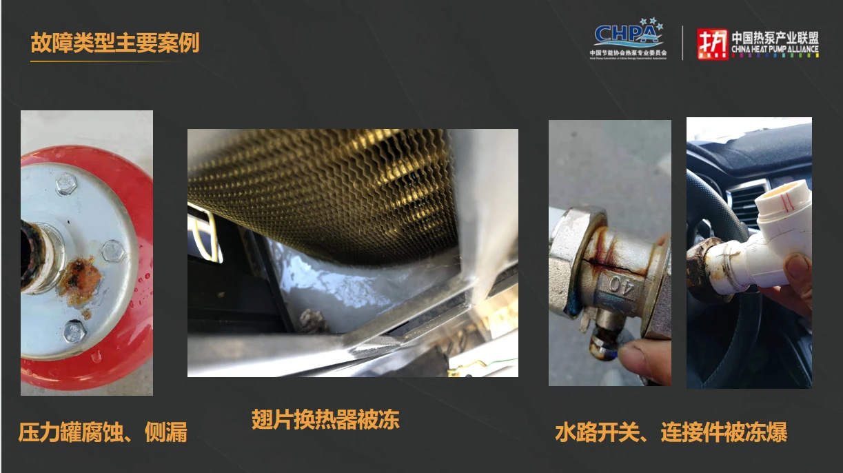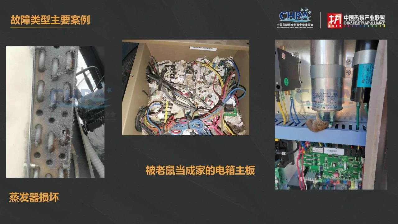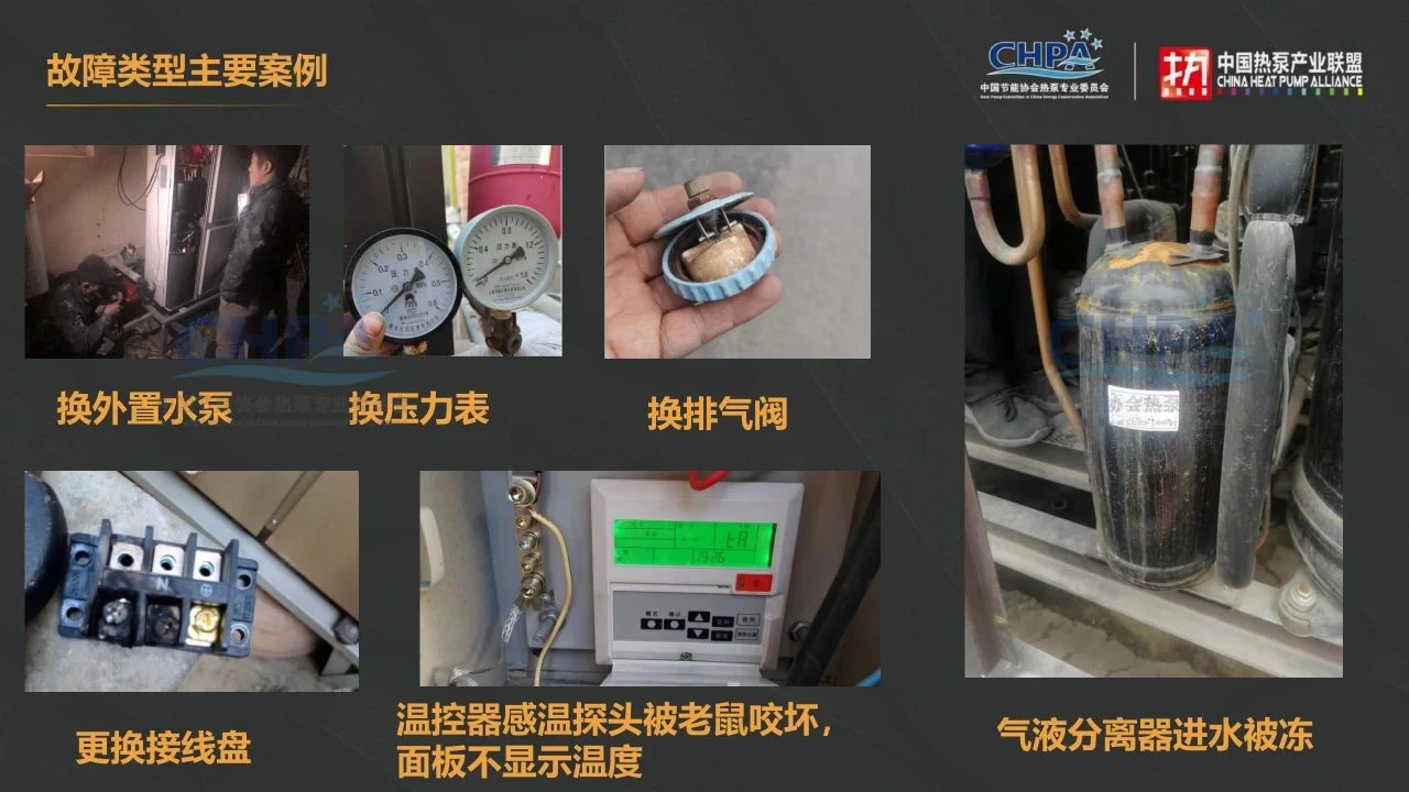 我们在冬季清洁取暖巡查过程中发现的一些空气源热泵主要故障类型,主要包括:1、漏冷媒,低压保护;2、水泵故障;3、压缩机故障;4、主板控制器故障;5、感温探头故障;6、设备被冻坏;7、风扇破碎;8、水路故障;9、极寒天气,设备制热能力下降,甚至停机;10、其他故障。