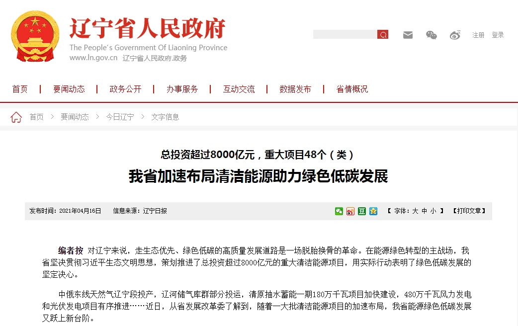 辽宁省人民政府官网今日发布以“总投资超过8000亿元,重大项目48个(类),我省加速布局清洁能源助力绿色低碳发展”为题的一篇文章。文章中提到辽宁省将在“十四五”时期推进清洁取暖项目投资410亿元,重点实施大型热源厂超低排放改造、城乡热网改造、工业余热利用、“煤改气”、“煤改电”、光热+、光伏+微风、生物质、清洁炉具、核能供暖等项目,确保人民群众清洁温暖过冬。