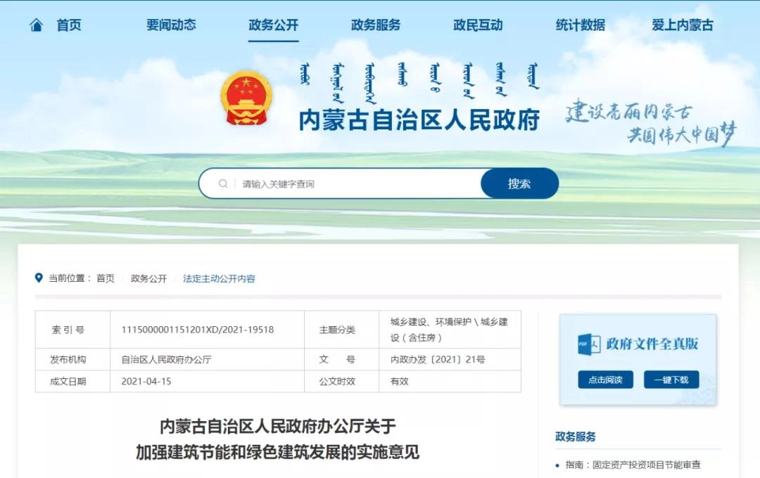 近日,内蒙古自治区人民政府发布《内蒙古自治区人民政府办公厅关于加强建筑节能和绿色建筑发展的实施意见》。以下简称《意见》。