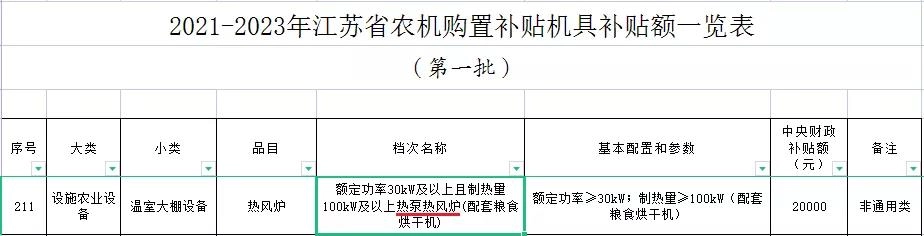 其中:额定功率30kW及以上且制热量100kW及以上热泵热风炉(配套粮食烘干机)可获中央财政补贴额20000元。