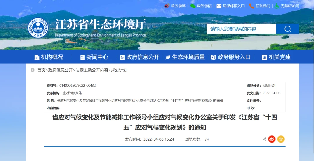 近日,江苏省应对气候变化及节能减排工作领导小组应对气候变化办公室关于印发《江苏省“十四五”应对气候变化规划》的通知。