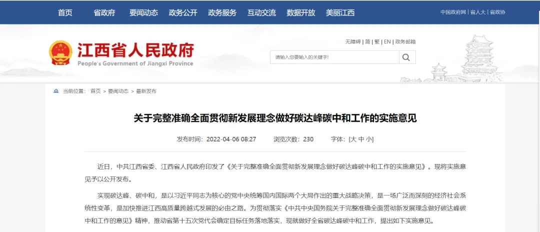 近日,中共江西省委、江西省人民政府印发《关于完整准确全面贯彻新发展理念做好碳达峰碳中和工作的实施意见》。