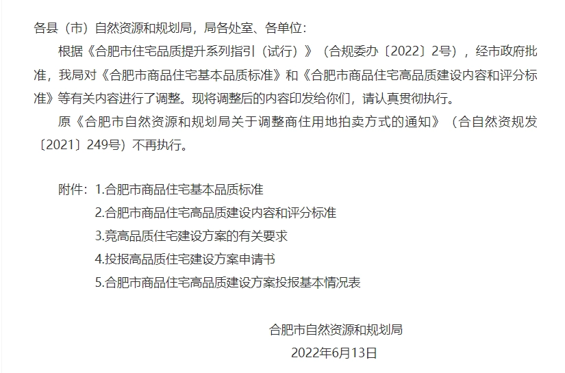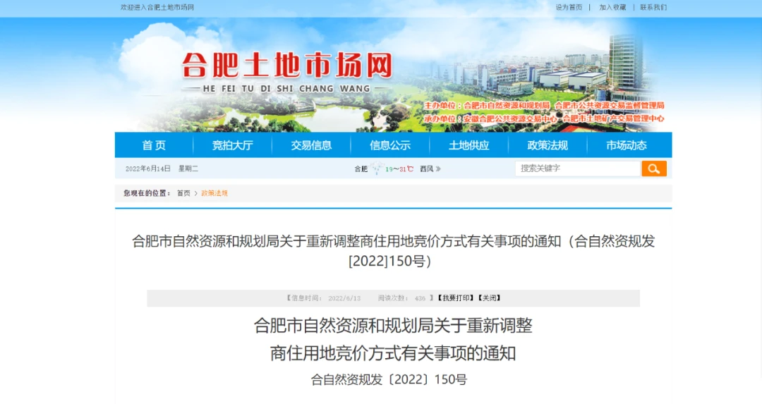 近日,合肥市自然资源和规划局印发关于重新调整商住用地竞价方式有关事项的通知(合自然资规发 [2022]150号)。